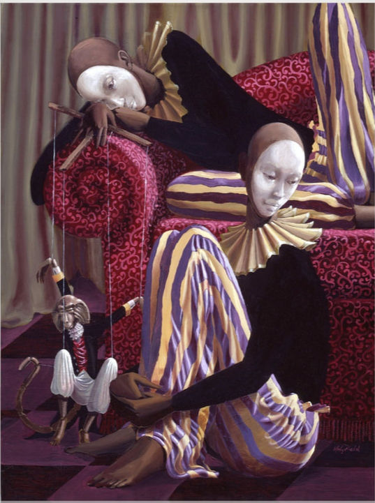 Such artists as Ernie Barnes and Norman Rockwell inspire John's style. Like Barnes, his compositions are full of movement and his characters elongated and distorted. John's images seem to capture a snap-shot of a moment. This method of visual story-telling is inspired by the narrative style of Norman Rockwell.